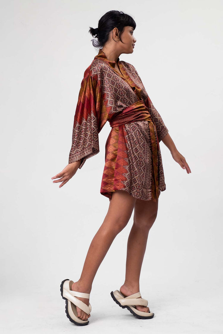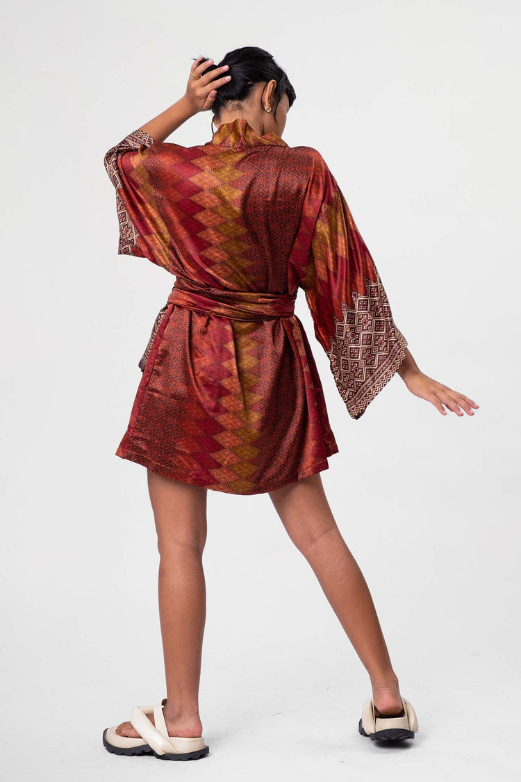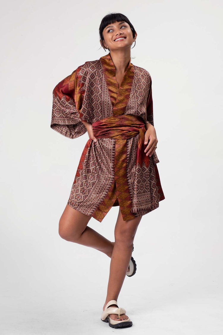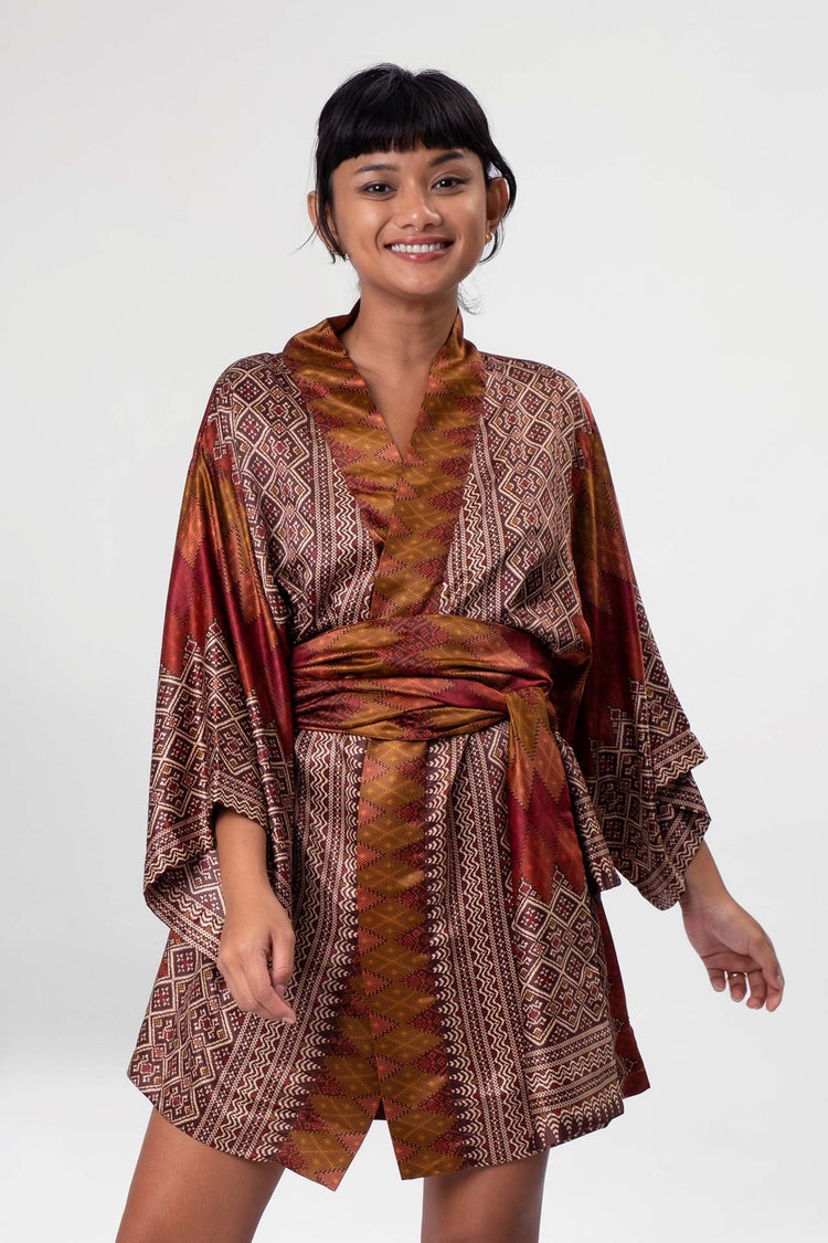 The rich patterns combined with luscious fabrics make Rafikimonos a unique experience to wear and see. Each is produced in limited quantities to ensure a bespoke and luxurious feel. Be it a formal affair, beach time, lounging at home, or a night out of town, Rafikimonos adapt for any occasion. It includes an extra wide belt (used as a head wrap or scarf too!) and a lined zippered travel pouch. Rafikimonos can be worn open, belted, or converted into a kaftan.