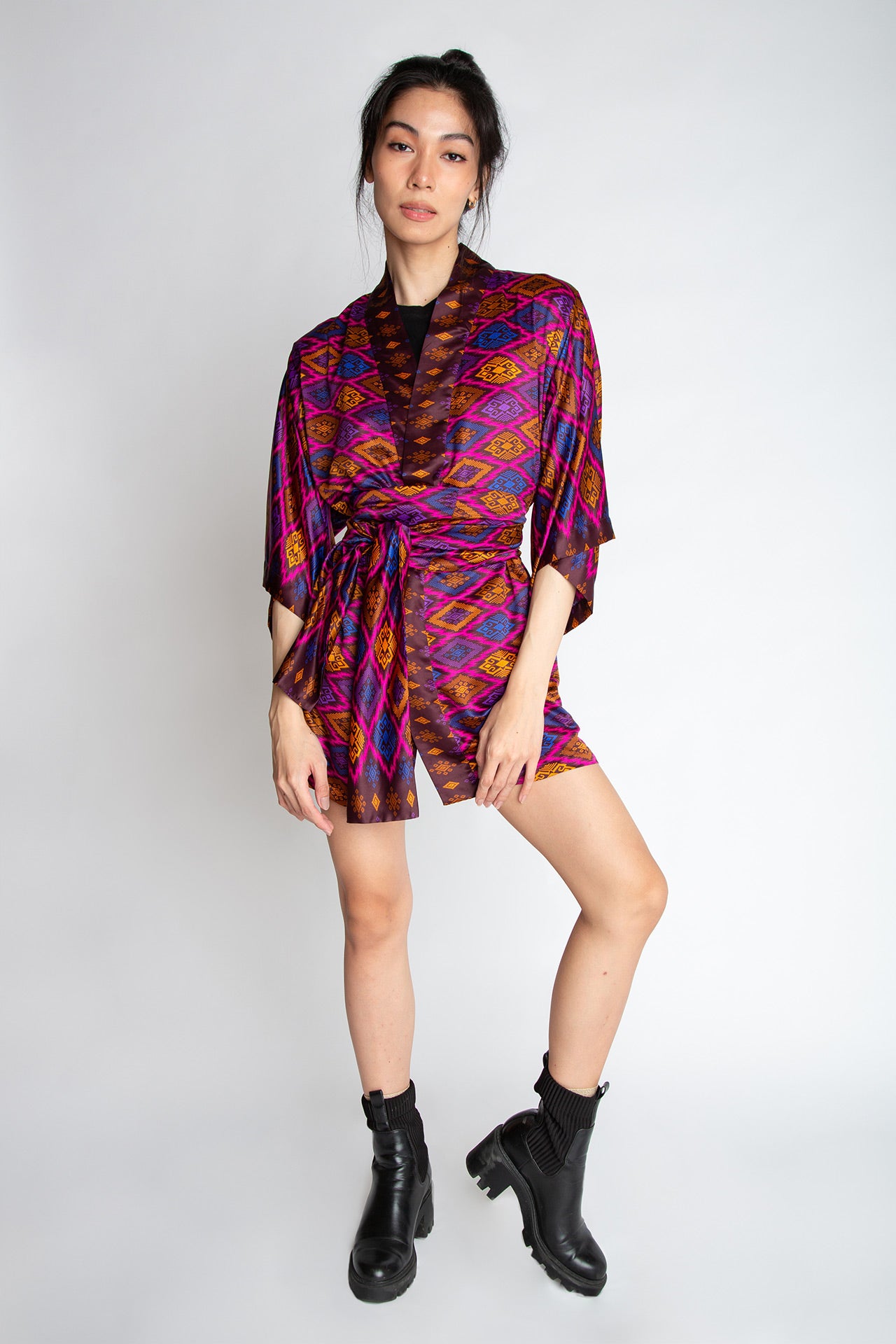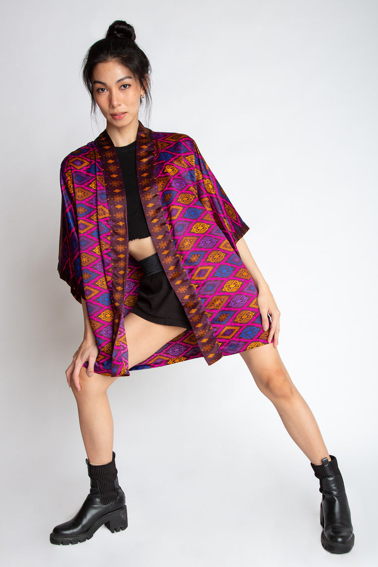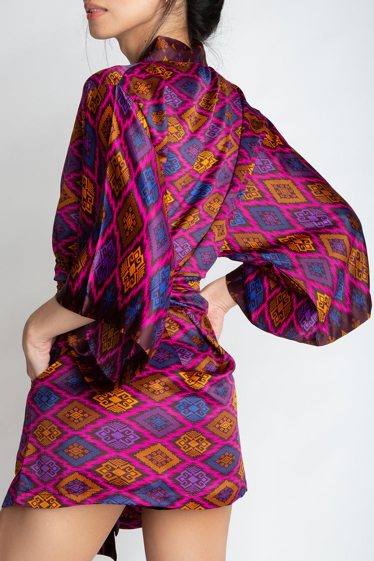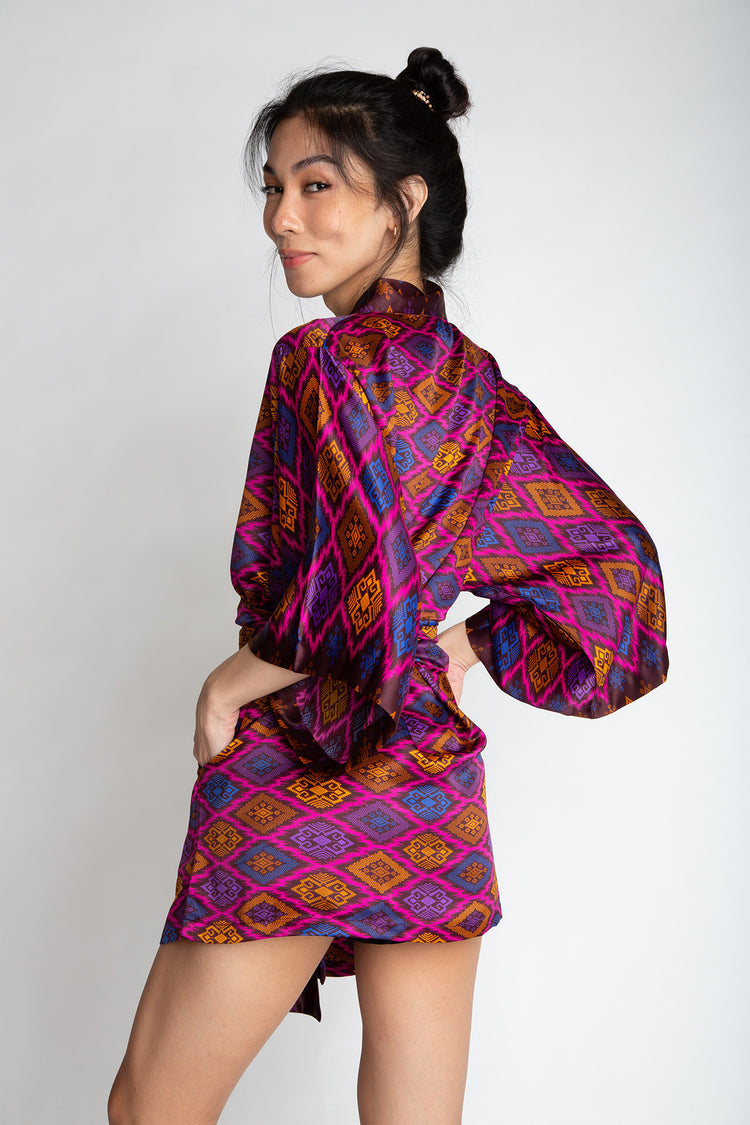 The rich patterns combined with luscious fabrics make Rafikimonos a unique experience to wear and see. Each is produced in limited quantities to ensure a bespoke and luxurious feel. Be it a formal affair, beach time, lounging at home, or a night out of town, Rafikimonos adapt for any occasion. It includes an extra wide belt (used as a head wrap or scarf too!) and a lined zippered travel pouch. Rafikimonos can be worn open, belted, or converted into a kaftan.