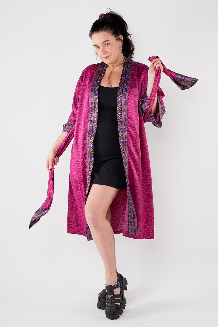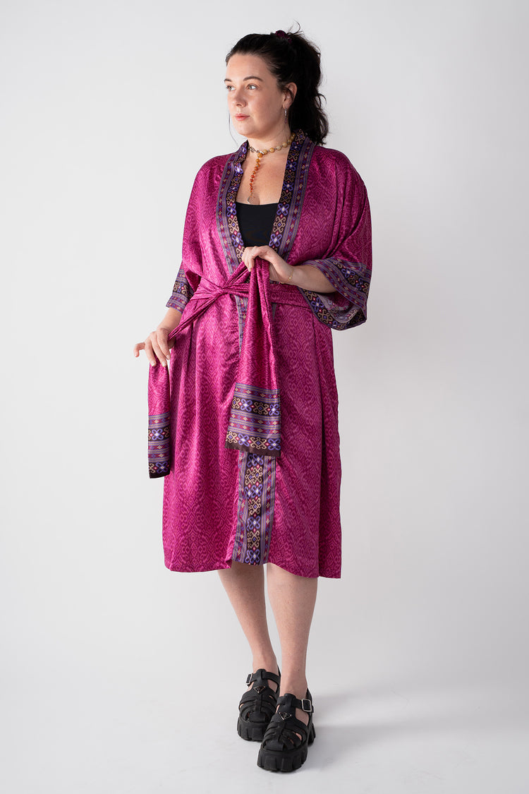 The combination of complex designs and luxurious fabric make every kimono-kaftan robe one-of-a-kind. Limited availability of each item ensures a strong bond between the robe and its owner. Complete the look with the included obi belt that can also function as a head wrap or scarf. This adaptable garment adapts to any event, from a formal gathering to a day at the beach, or to casual time at home or a night out. Wear it unclosed, with the belt, or as a kaftan.