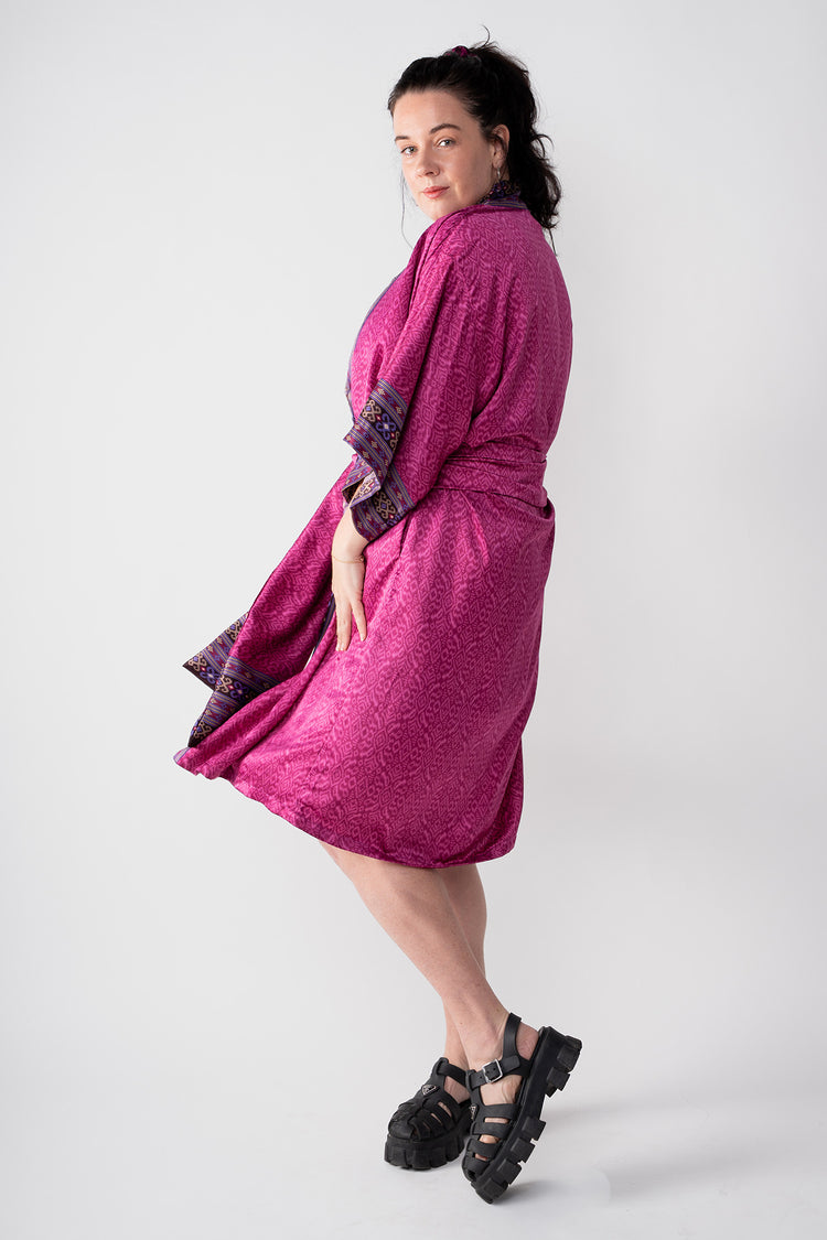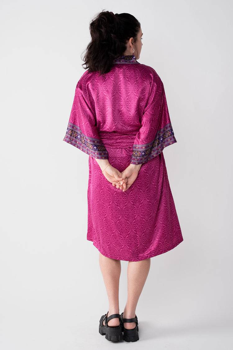 The kimono-kaftan robe is built to last. It’s made with a silk-polyester blend which, compared to pure silk, is easy care/easy wear. To maintain its softness, hand wash your robe gently using mild soap and hang it up to dry. You can also throw it inside a mesh laundry bag before putting it in the washing machine set to gentle/cool or send it to the dry-cleaners. Wash with similar colors. Lightly iron or steam when needed to get it looking like new again.