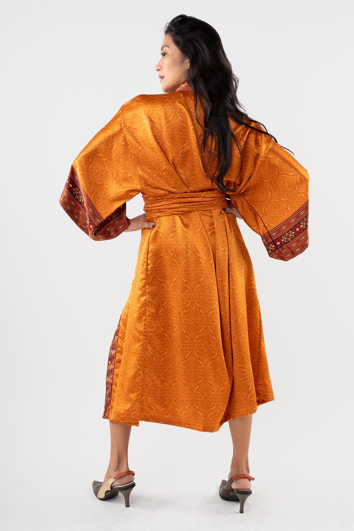 The kimono-kaftan robe is built to last. It’s made with a silk-polyester blend which, compared to pure silk, is easy care/easy wear. To maintain its softness, hand wash your robe gently using mild soap and hang it up to dry. You can also throw it inside a mesh laundry bag before putting it in the washing machine set to gentle/cool or send it to the dry-cleaners. Wash with similar colors. Lightly iron or steam when needed to get it looking like new again.
