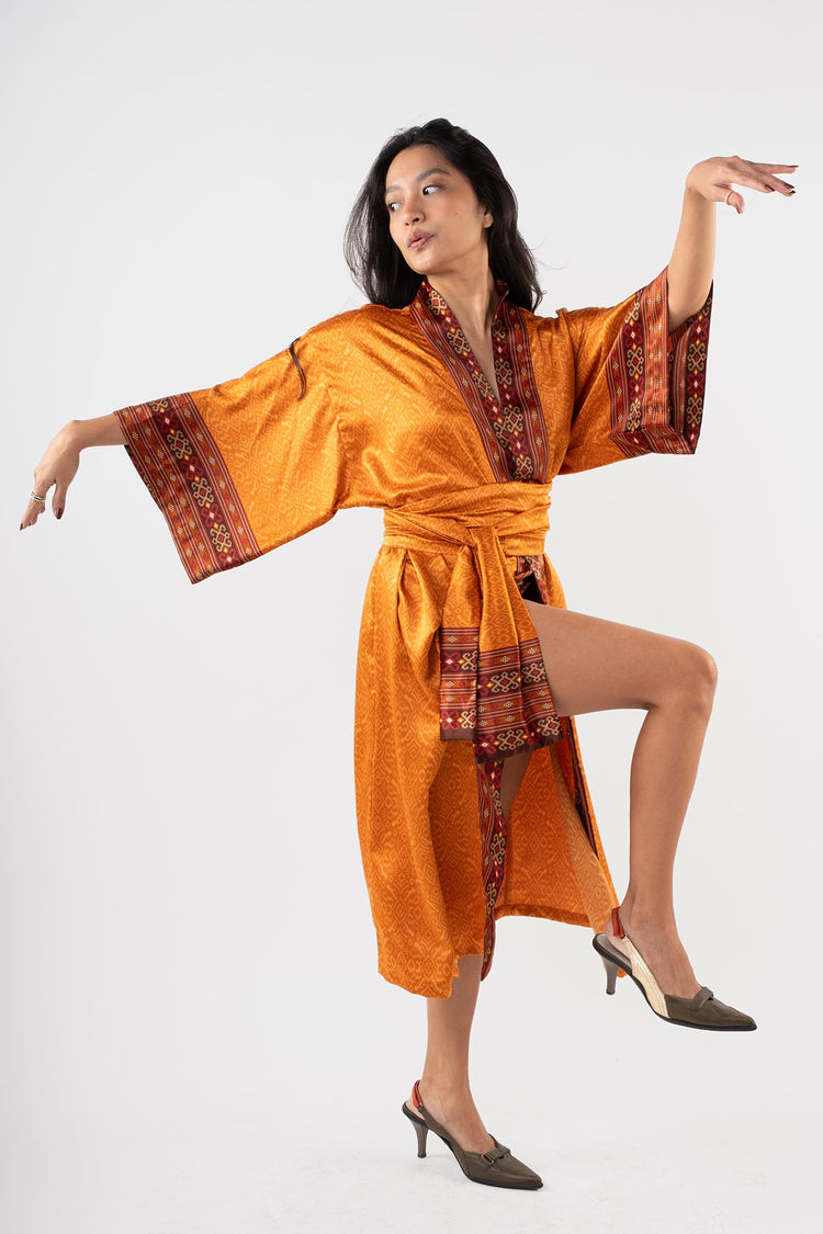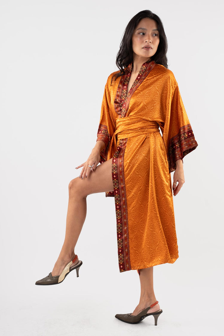 The combination of complex designs and luxurious fabric make every kimono-kaftan robe one-of-a-kind. Limited availability of each item ensures a strong bond between the robe and its owner. Complete the look with the included obi belt that can also function as a head wrap or scarf. This adaptable garment adapts to any event, from a formal gathering to a day at the beach, or to casual time at home or a night out. Wear it unclosed, with the belt, or as a kaftan.