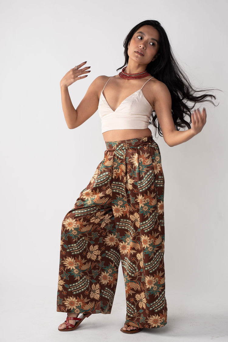 Rafiki Party Pants are flowy bottoms that add fun and flare to any ensemble. These wide legged palazzo pants had a waistband that is flat in front and garterized in back. Party pants are your perfect flexible and versatile pants for every occasion, be it a beach trip, a wedding, and of course, a dance party.