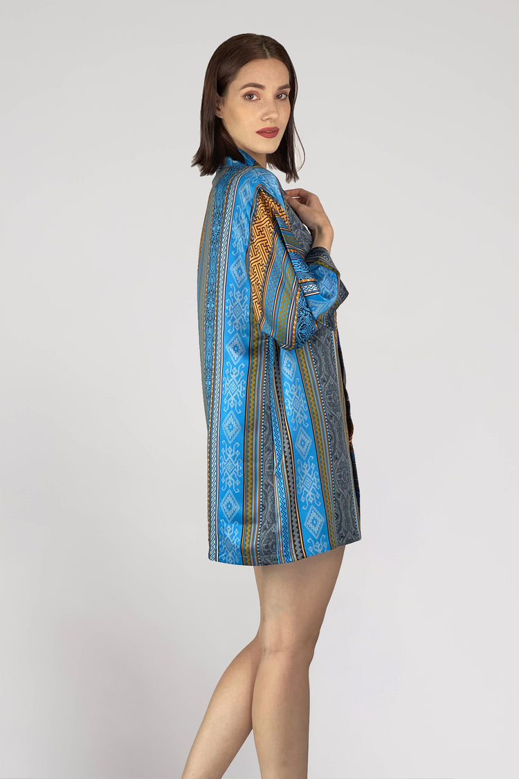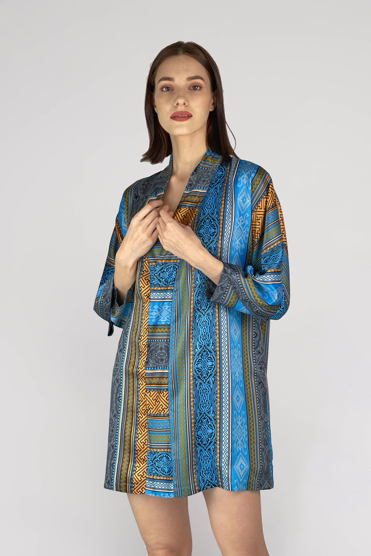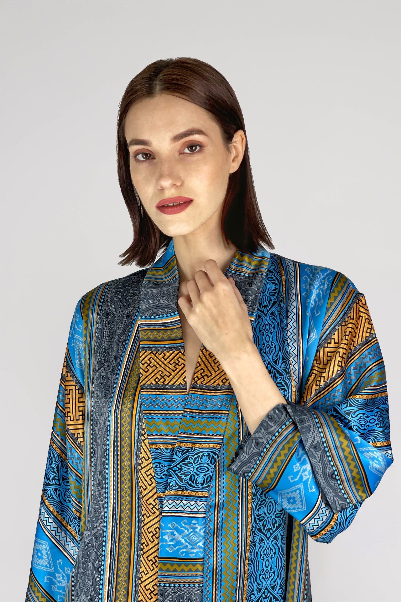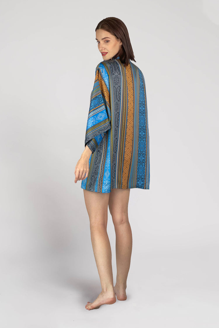 The rich patterns combined with luscious fabrics make Rafikimonos a unique experience to wear and see. Each is produced in limited quantities to ensure a bespoke and luxurious feel. Be it a formal affair, beach time, lounging at home, or a night out of town, Rafikimonos adapt for any occasion. It includes an extra wide belt (used as a head wrap or scarf too!) and a lined zippered travel pouch. Rafikimonos can be worn open, belted, or converted into a kaftan.