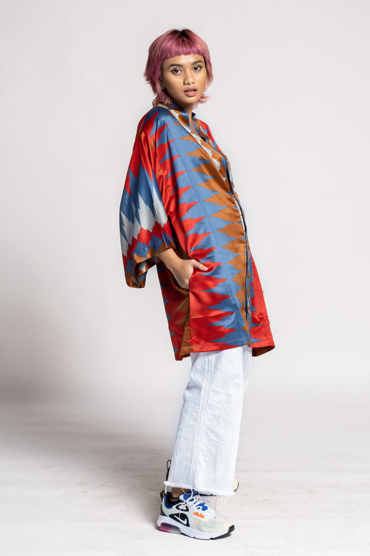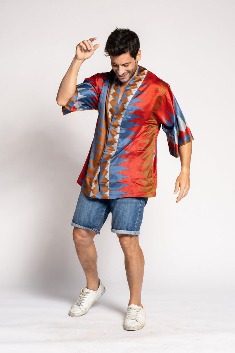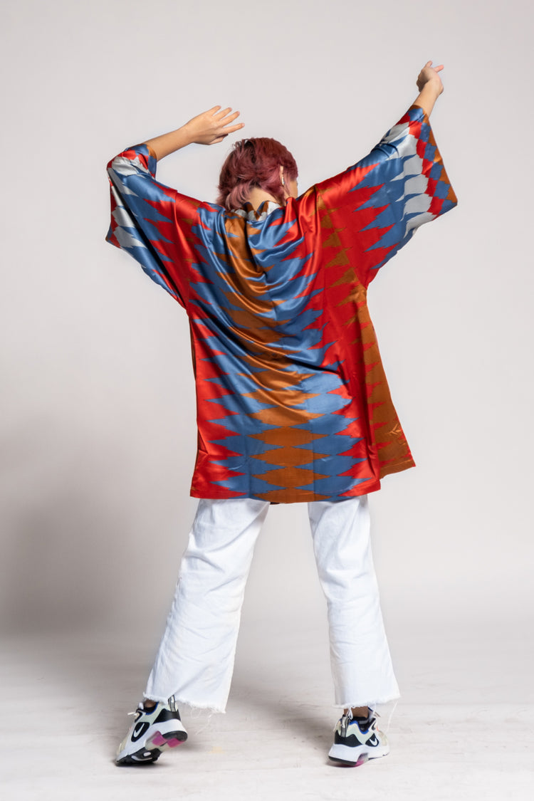 The rich patterns combined with luscious fabrics make Rafikimonos a unique experience to wear and see. Each is produced in limited quantities to ensure a bespoke and luxurious feel. Be it a formal affair, beach time, lounging at home, or a night out of town, Rafikimonos adapt for any occasion. It includes an extra wide belt (used as a head wrap or scarf too!) and a lined zippered travel pouch. Rafikimonos can be worn open, belted, or converted into a kaftan.