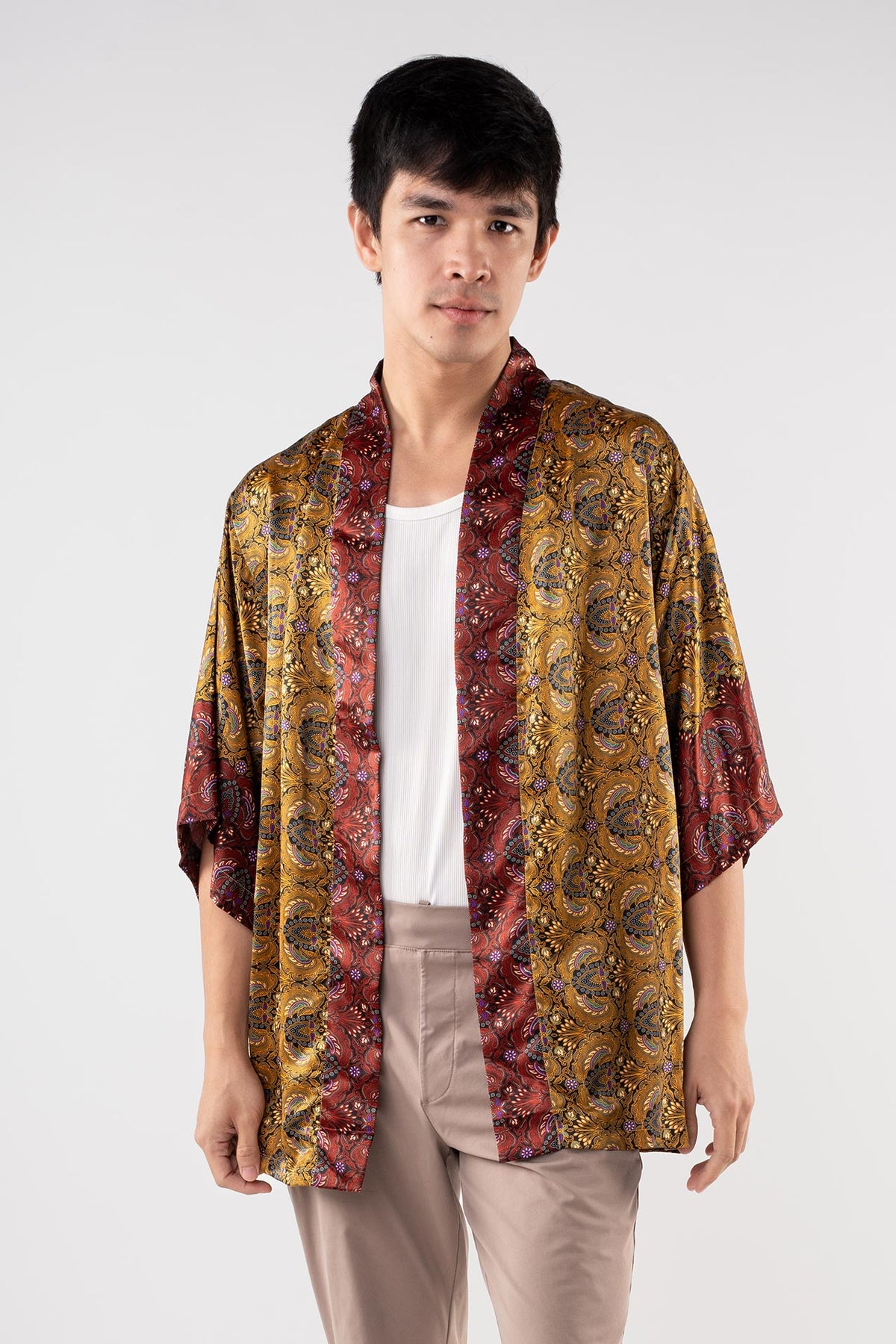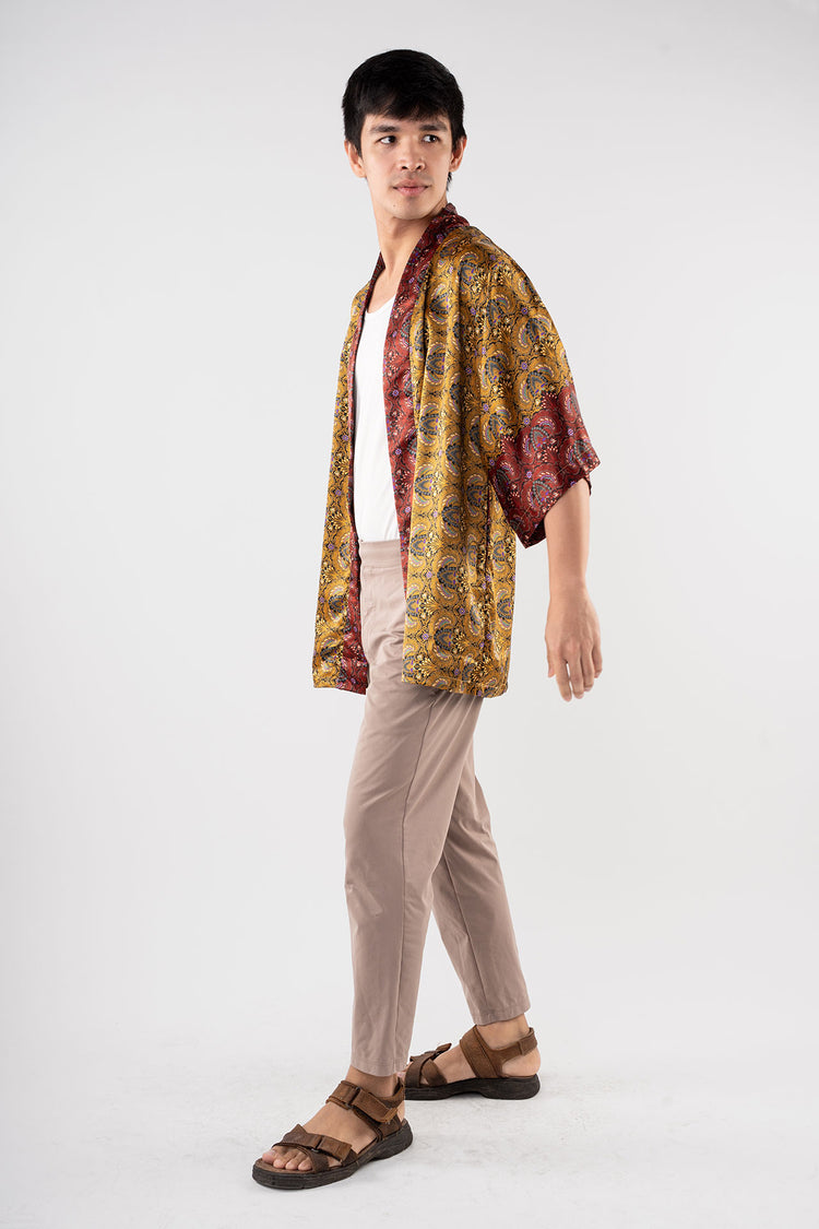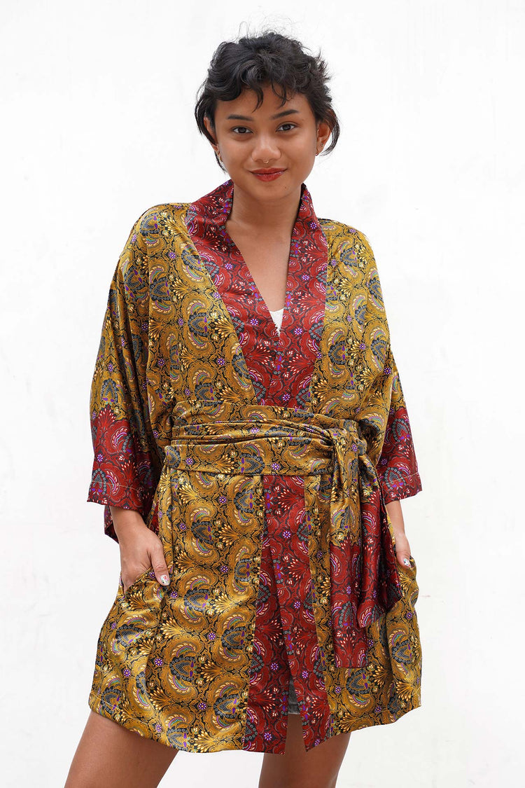 The kimono-kaftan robe is built to last. It’s made with a silk-polyester blend which, compared to pure silk, is easy care/easy wear. To maintain its softness, hand wash your robe gently using mild soap and hang it up to dry. You can also throw it inside a mesh laundry bag before putting it in the washing machine set to gentle/cool or send it to the dry-cleaners. Wash with similar colors. Lightly iron or steam when needed to get it looking like new again.