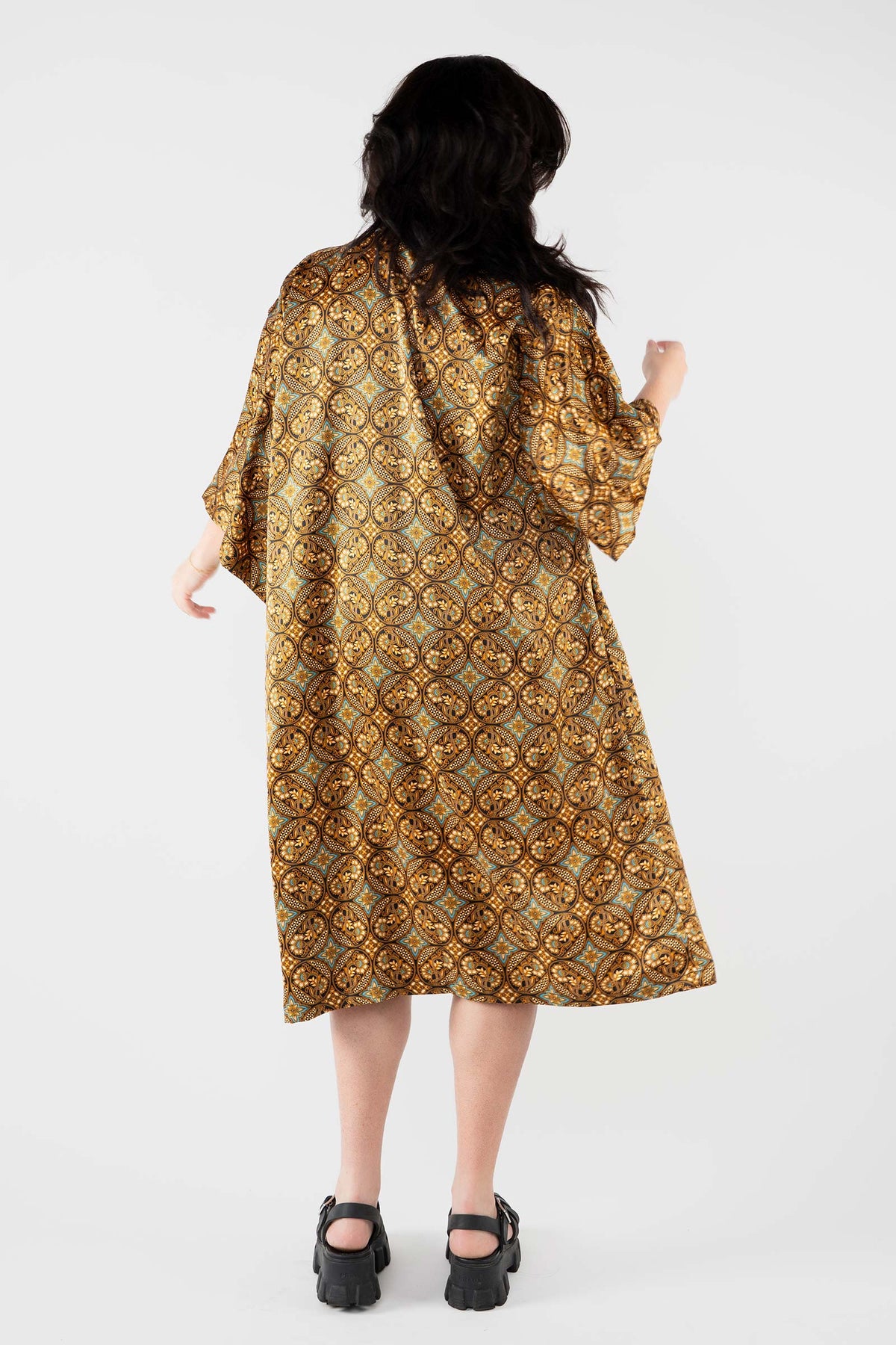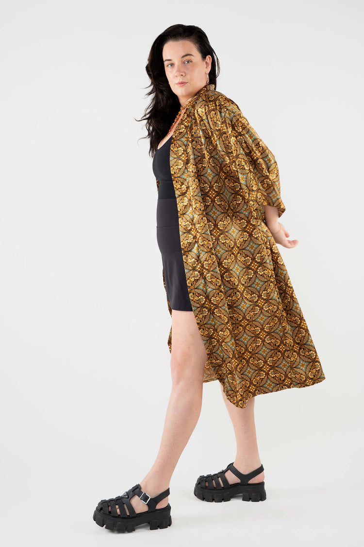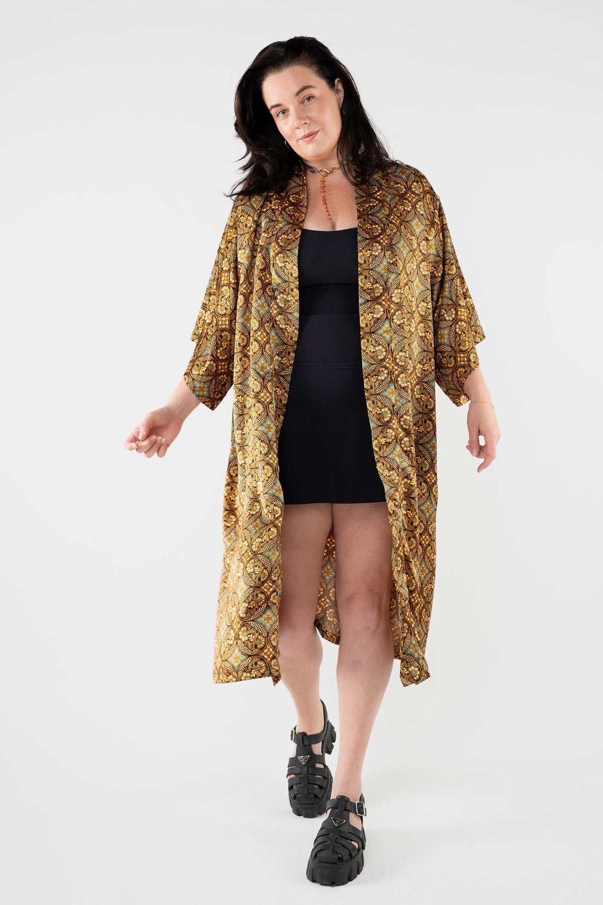 The combination of complex designs and luxurious fabric make every kimono-kaftan robe one-of-a-kind. Limited availability of each item ensures a strong bond between the robe and its owner. Complete the look with the included obi belt that can also function as a head wrap or scarf. This adaptable garment adapts to any event, from a formal gathering to a day at the beach, or to casual time at home or a night out. Wear it unclosed, with the belt, or as a kaftan.