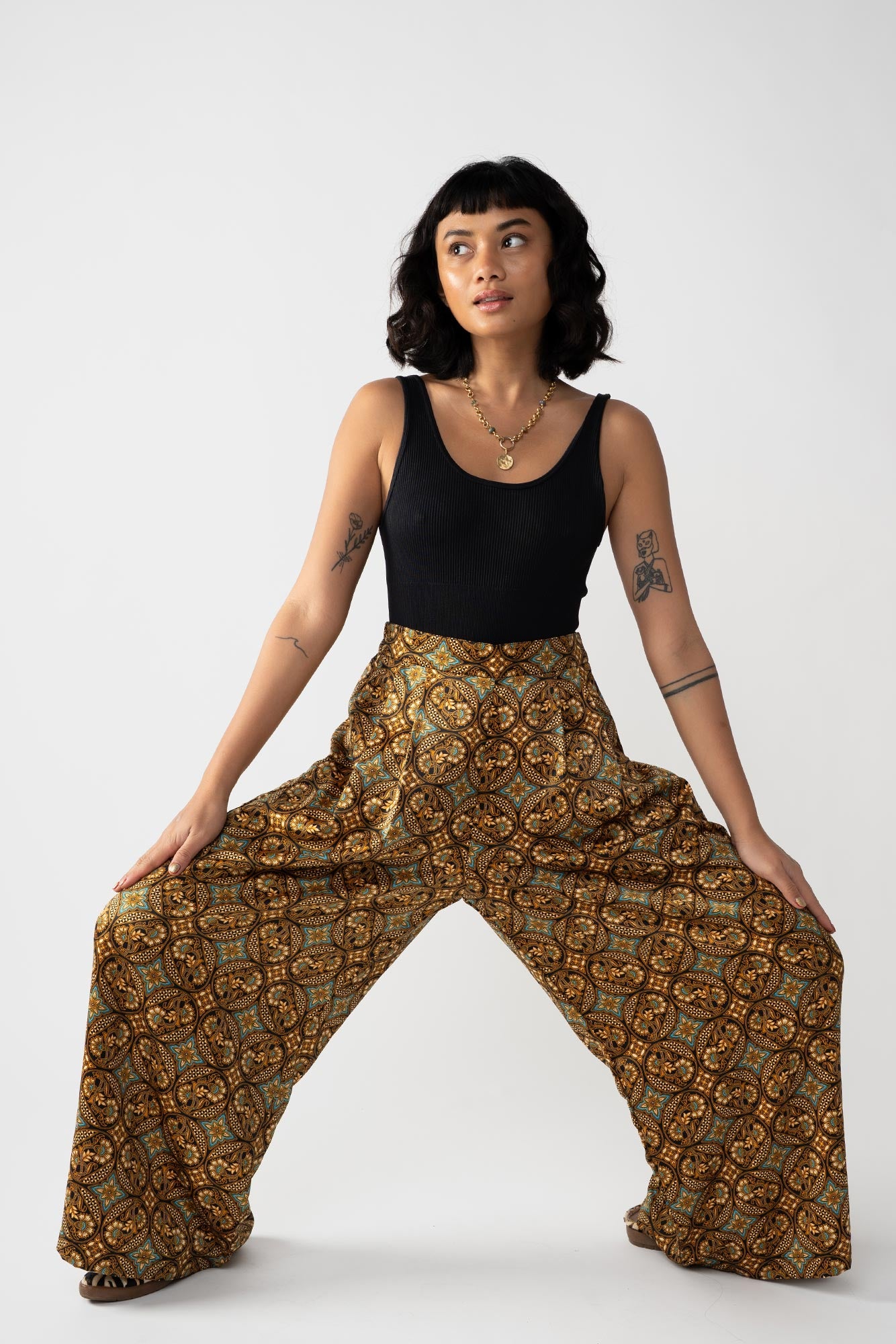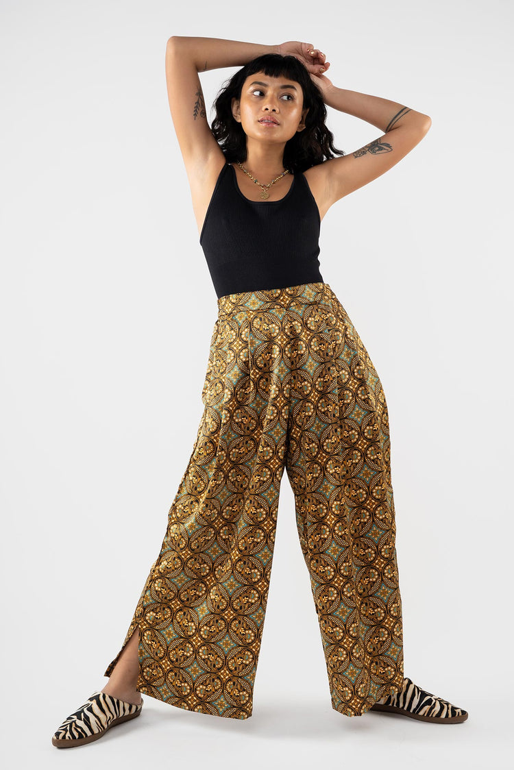 Rafiki Party Pants are flowy bottoms that add fun and flare to any ensemble. These extra wide legged palazzo pants had a waistband that is flat in front and garterized in back. Party pants are your perfect flexible and versatile pants for every occasion, be it a beach trip, a wedding, and of course, a dance party.