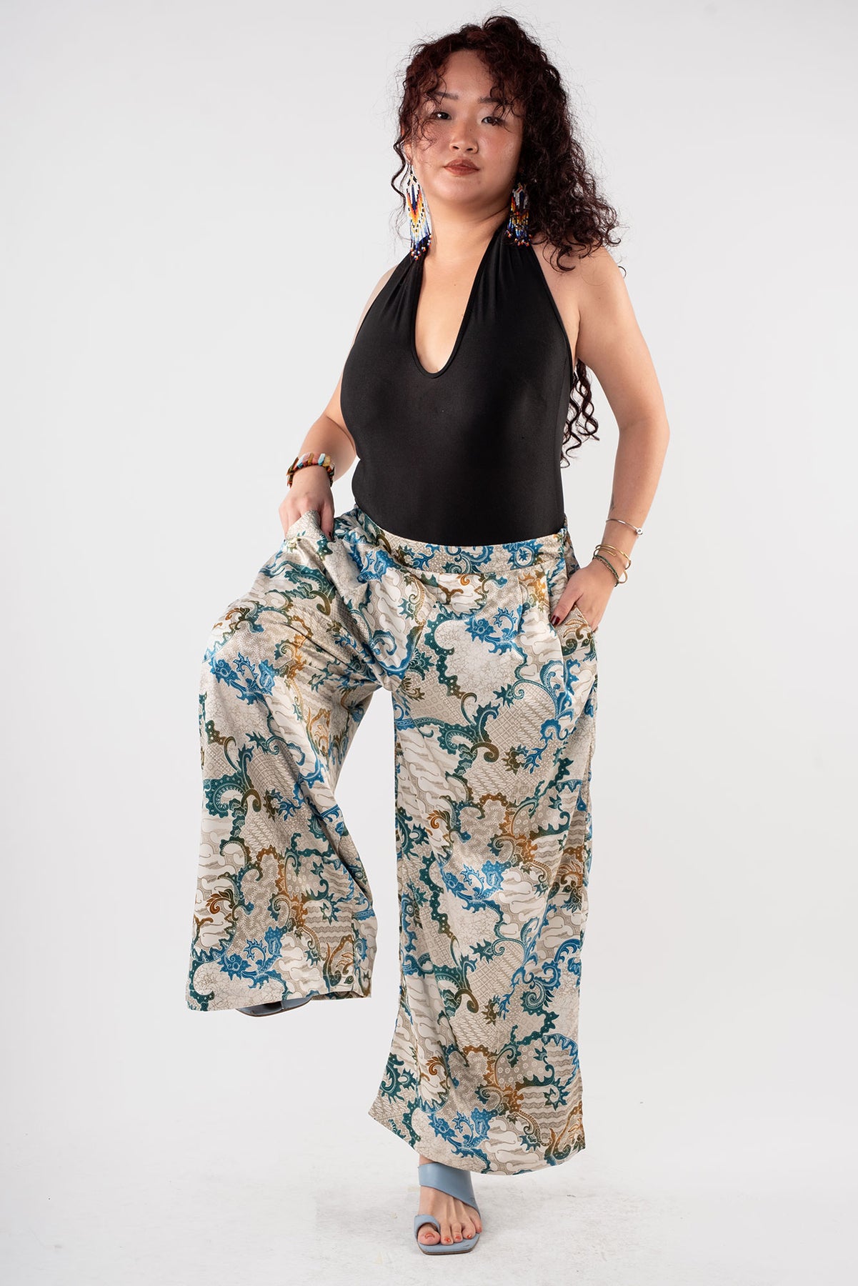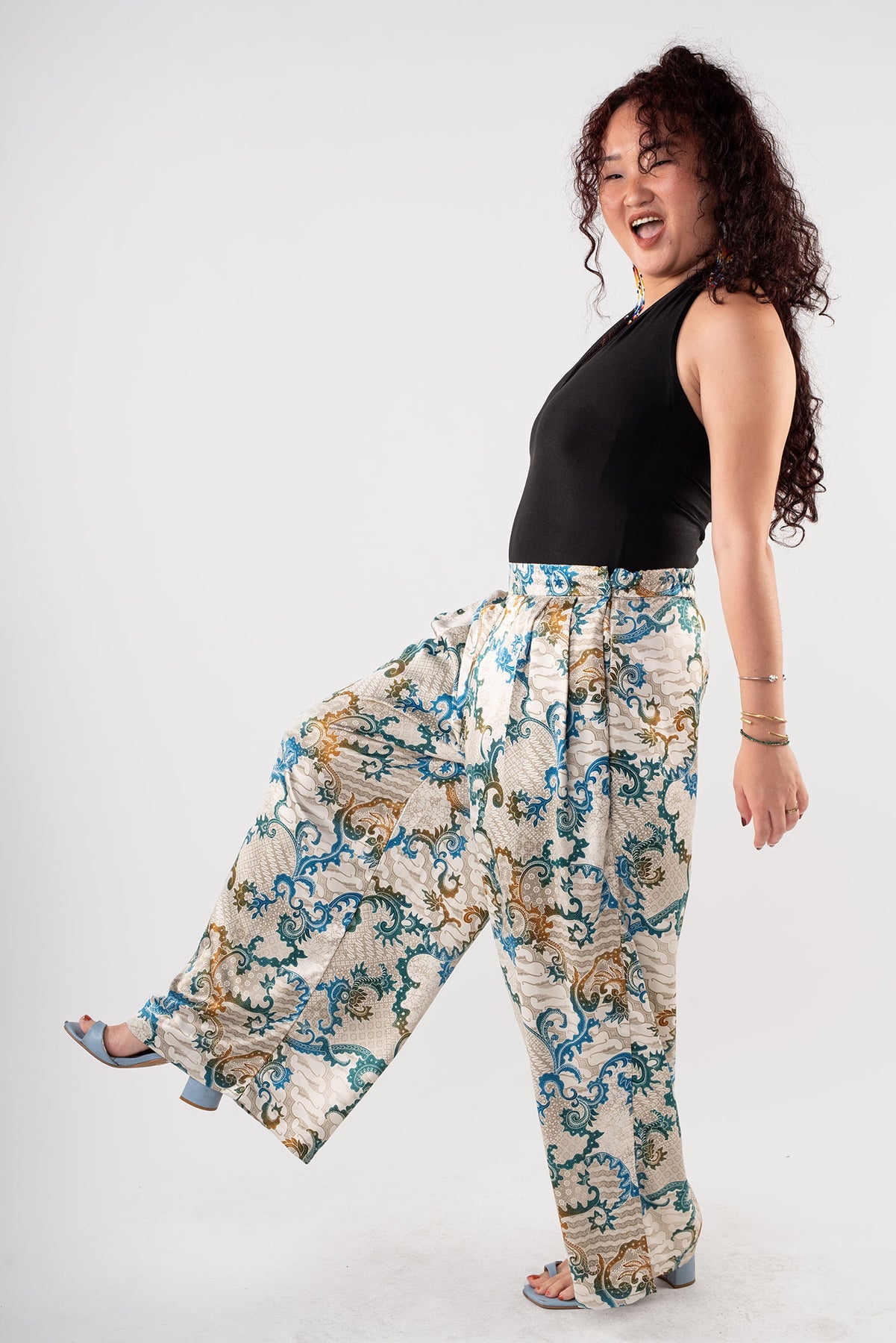 Rafiki Party Pants are flowy bottoms that add fun and flare to any ensemble. These extra wide legged palazzo pants had a waistband that is flat in front and garterized in back. Party pants are your perfect flexible and versatile pants for every occasion, be it a beach trip, a wedding, and of course, a dance party.