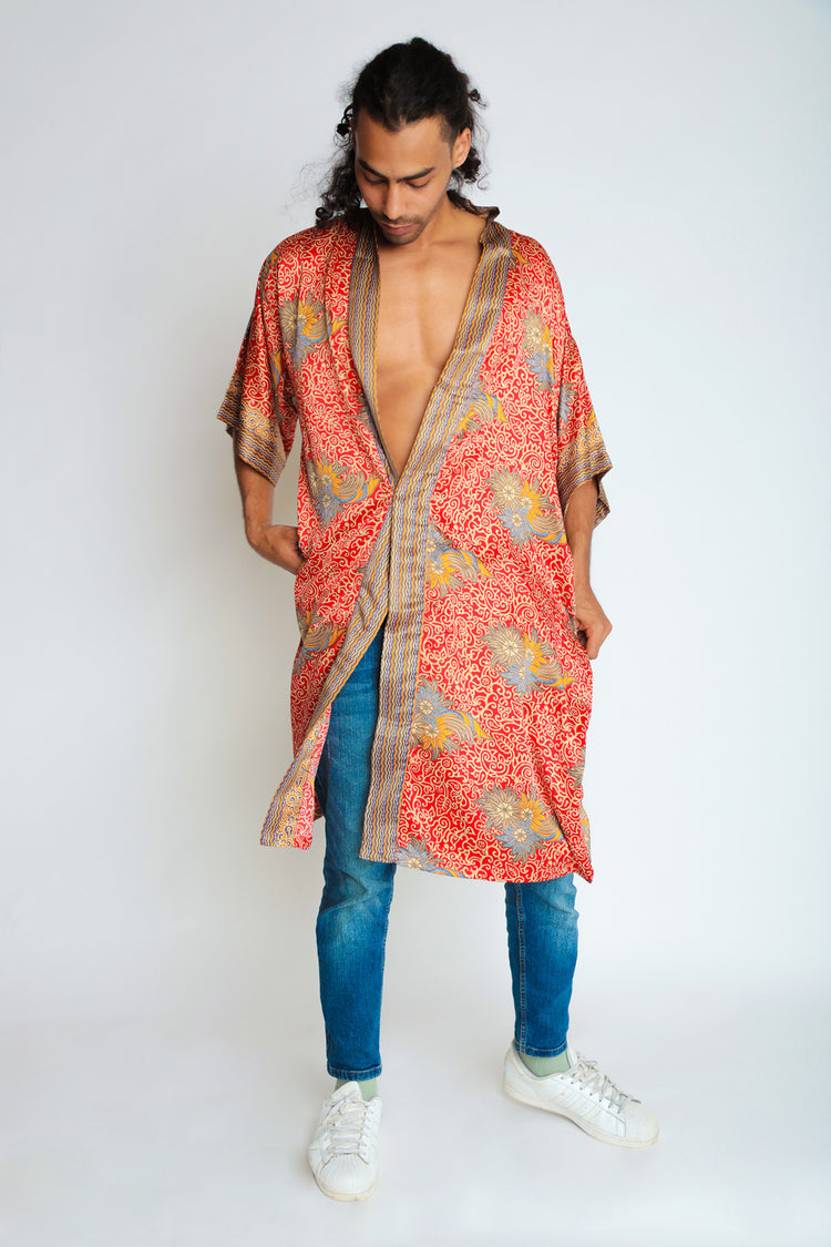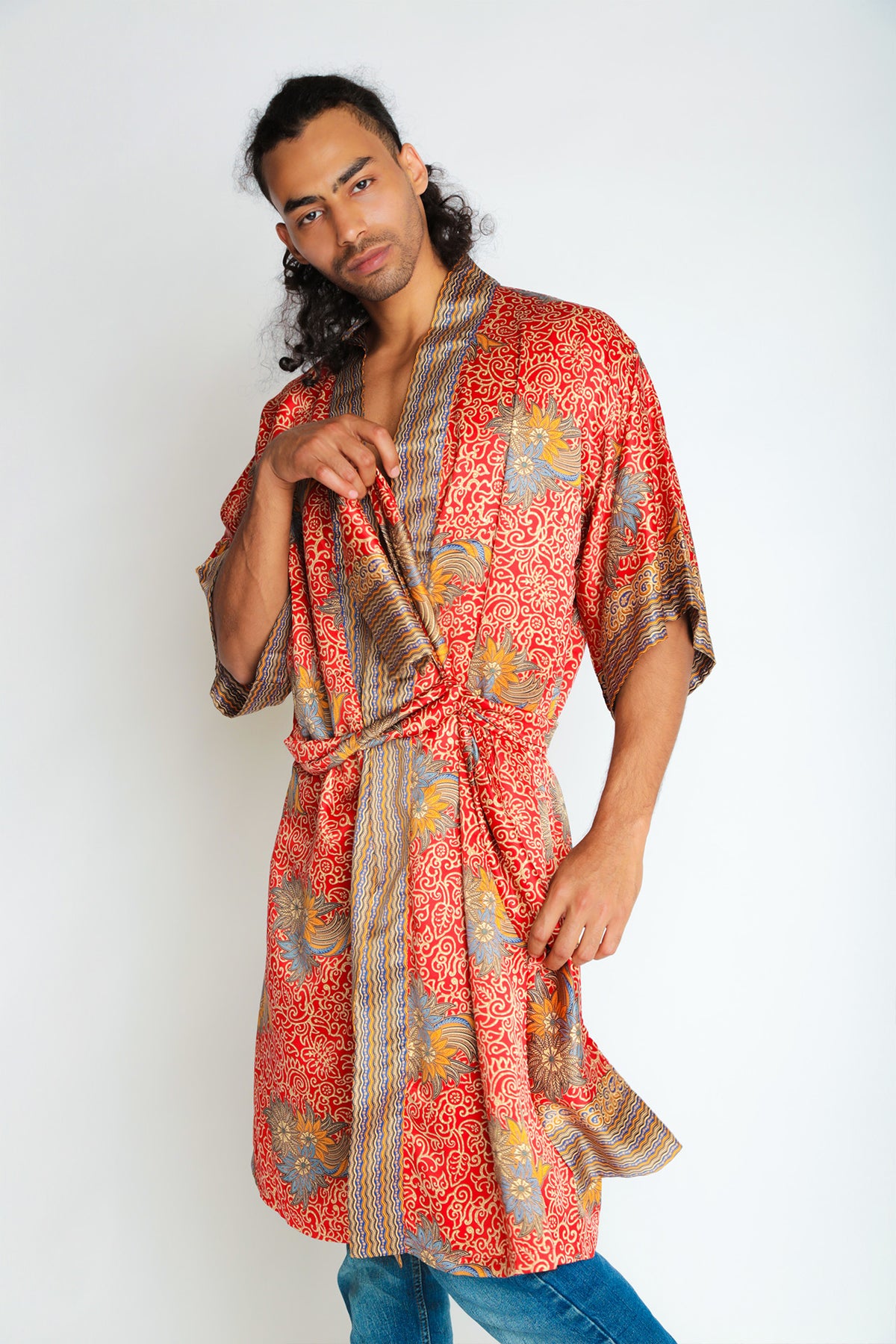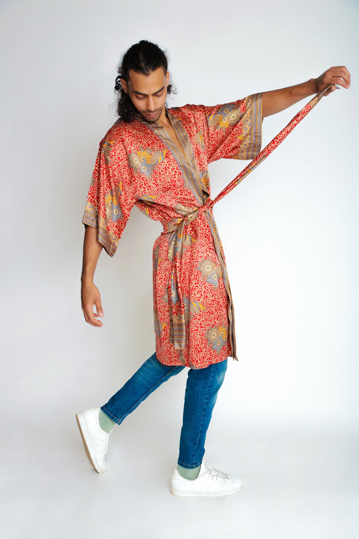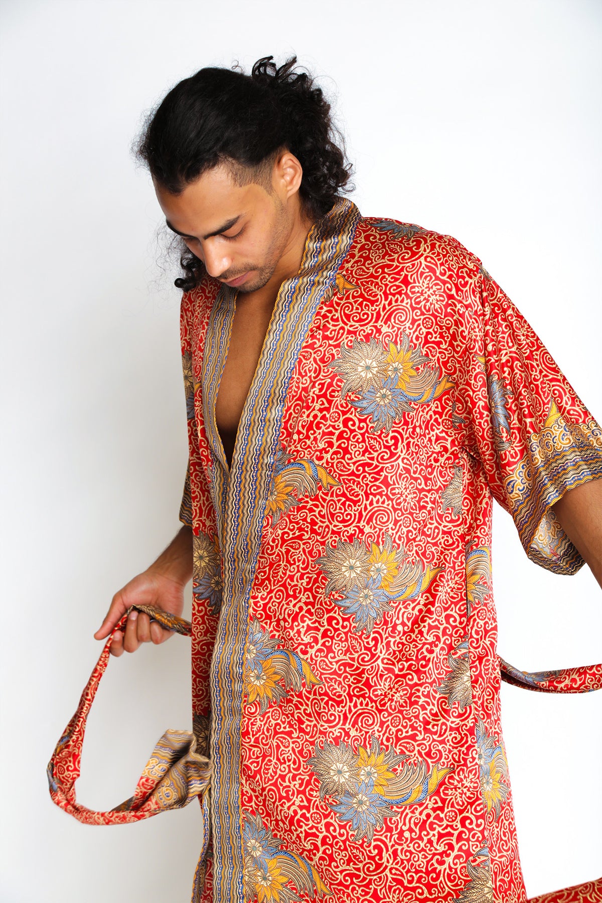 The kimono-kaftan robe is built to last. It’s made with a silk-polyester blend which, compared to pure silk, is easy care/easy wear. To maintain its softness, hand wash your robe gently using mild soap and hang it up to dry. You can also throw it inside a mesh laundry bag before putting it in the washing machine set to gentle/cool or send it to the dry-cleaners. Wash with similar colors. Lightly iron or steam when needed to get it looking like new again.