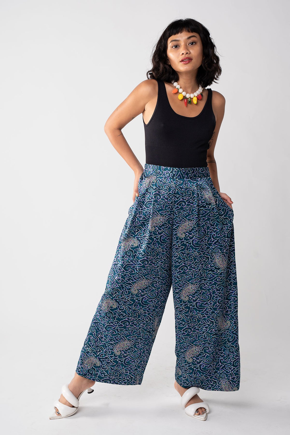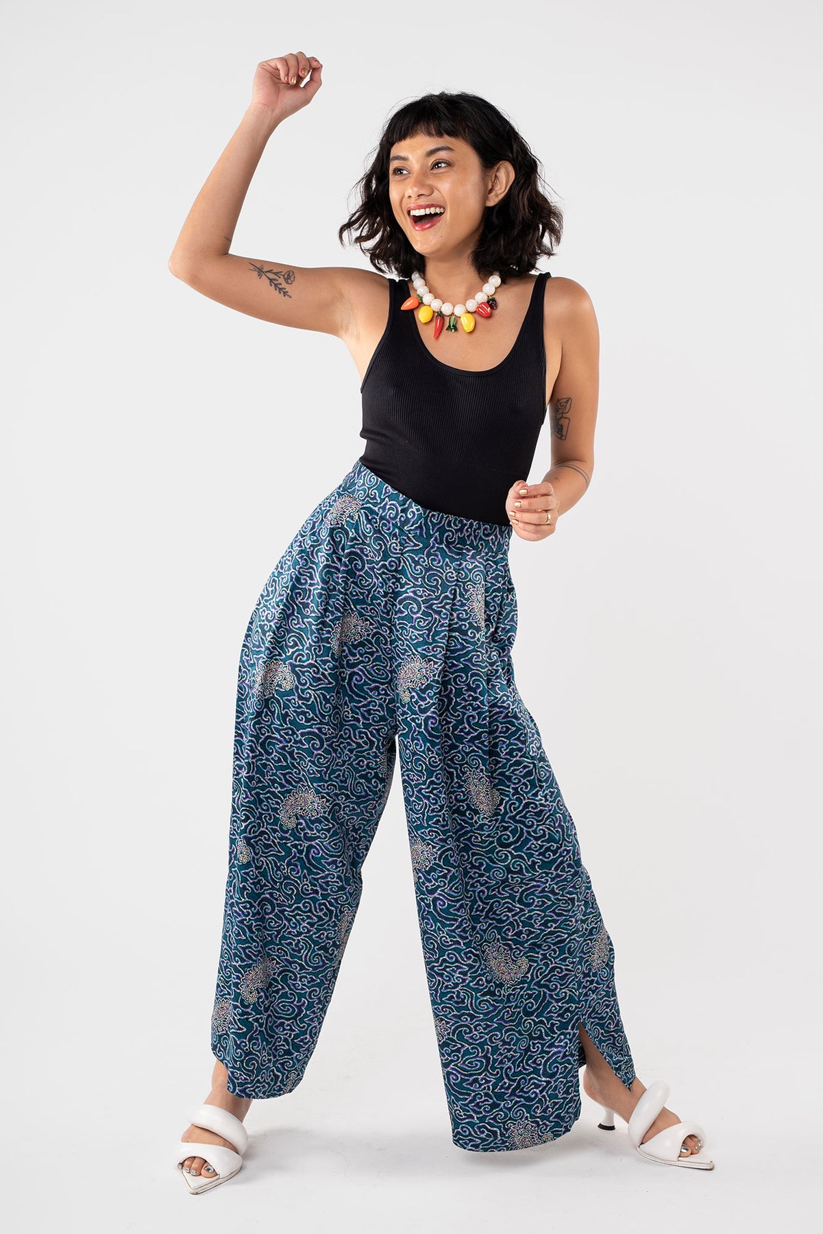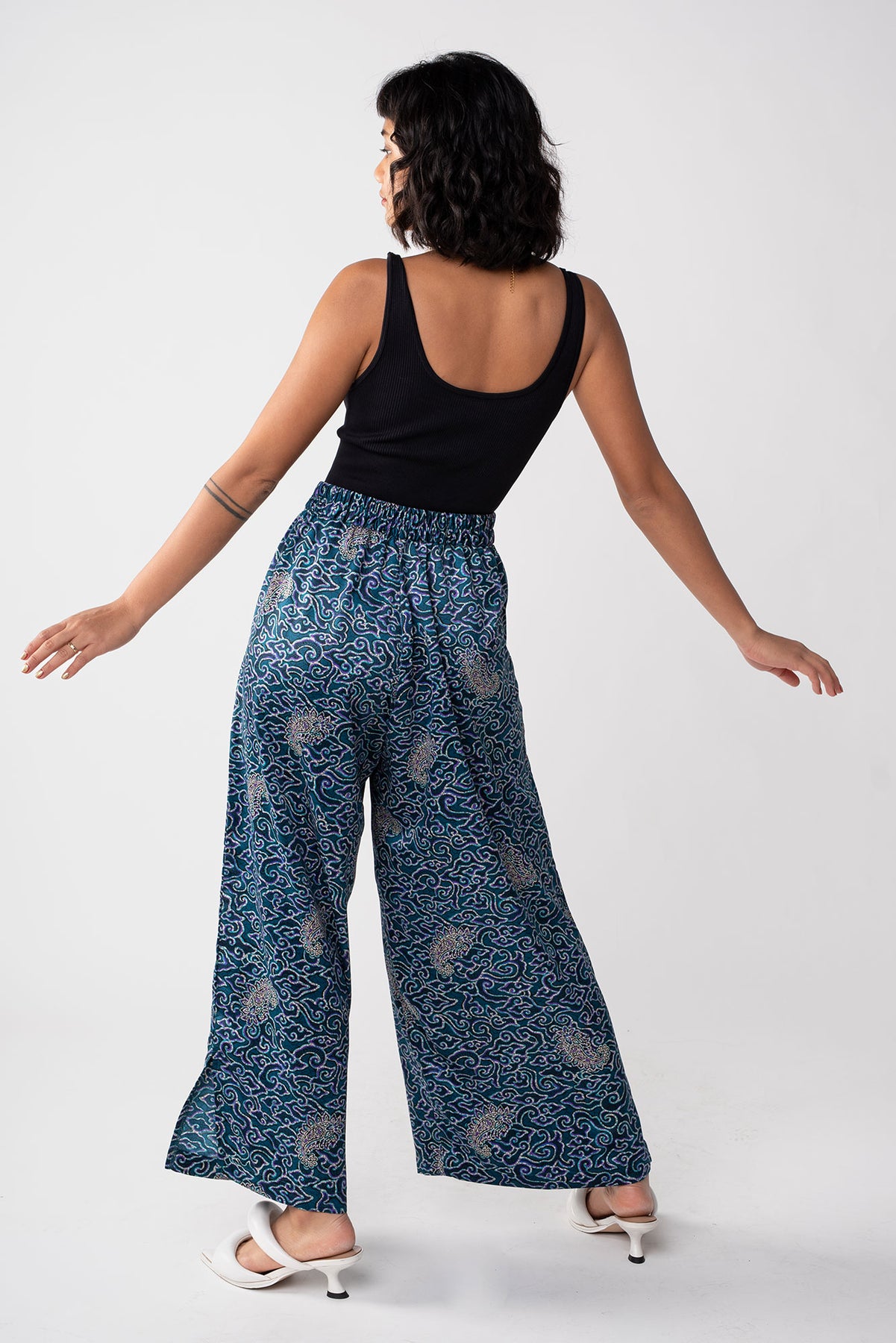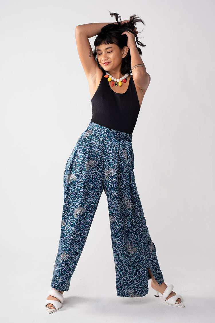 Rafiki Party Pants are flowy bottoms that add fun and flare to any ensemble. These wide legged palazzo pants had a waistband that is flat in front and garterized in back. Party pants are your perfect flexible and versatile pants for every occasion, be it a beach trip, a wedding, and of course, a dance party.