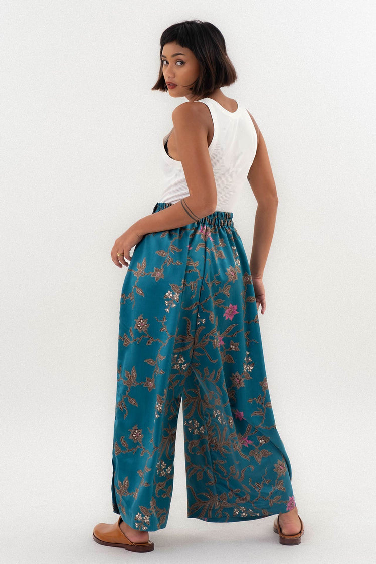 Rafiki Party Pants are flowy bottoms that add fun and flare to any ensemble. These extra wide legged palazzo pants had a waistband that is flat in front and garterized in back. Party pants are your perfect flexible and versatile pants for every occasion, be it a beach trip, a wedding, and of course, a dance party.