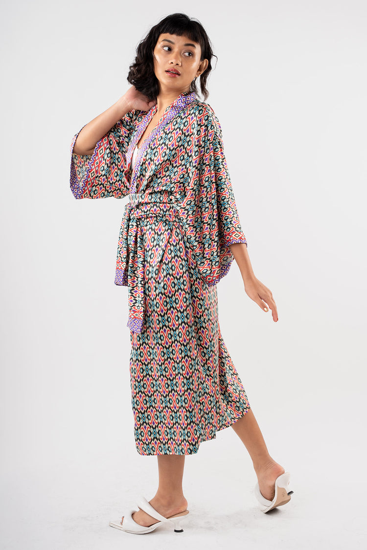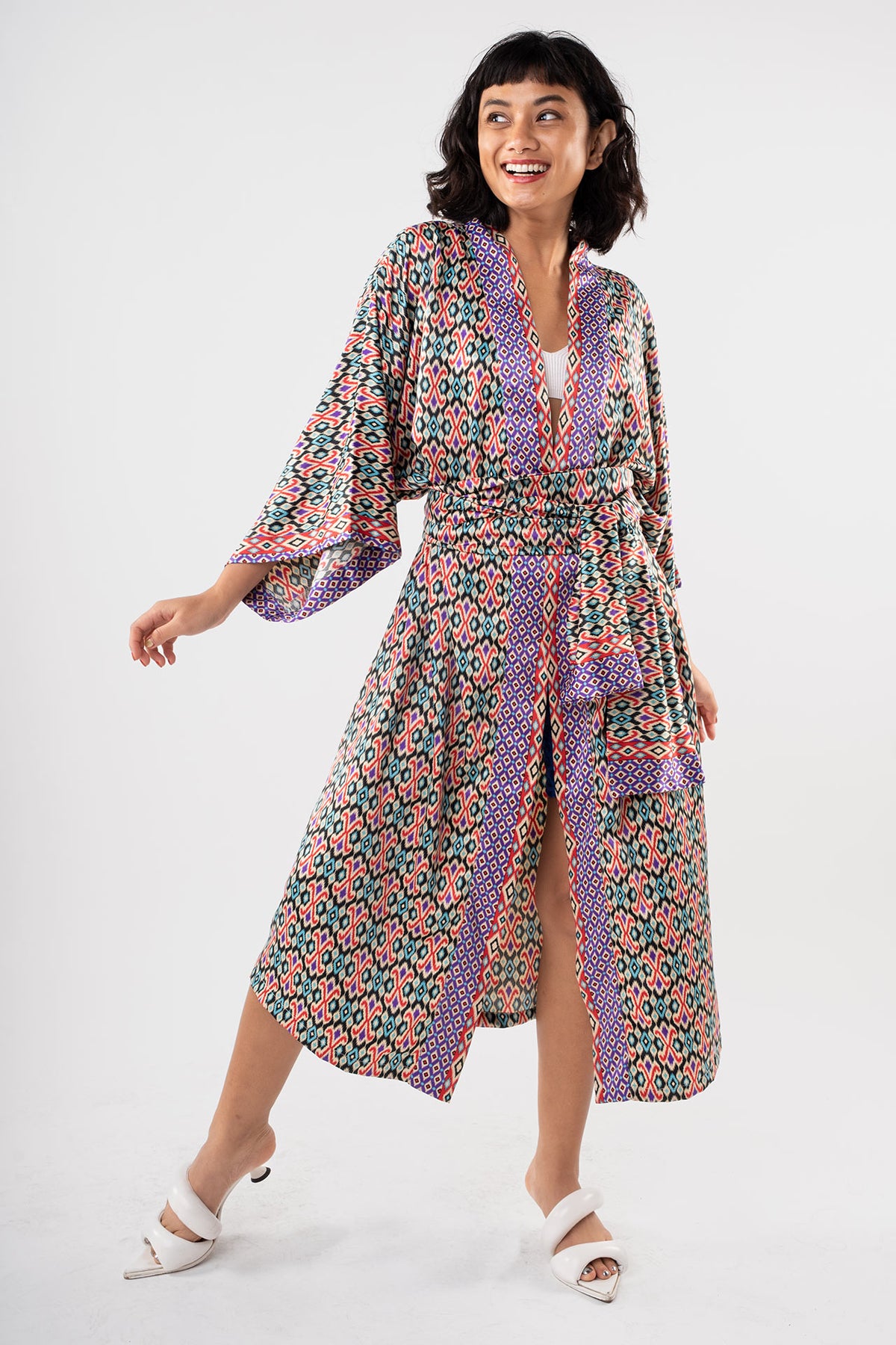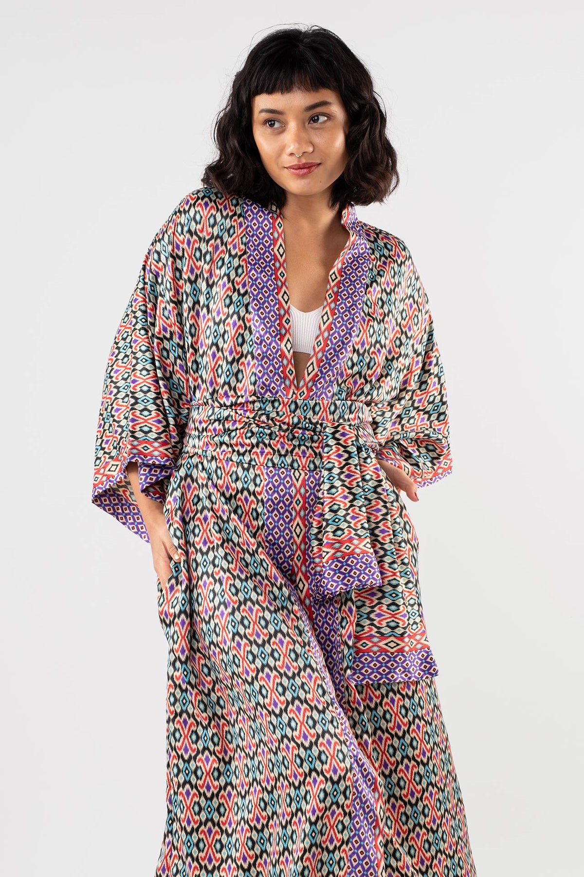 The combination of complex designs and luxurious fabric make every kimono-kaftan robe one-of-a-kind. Limited availability of each item ensures a strong bond between the robe and its owner. Complete the look with the included obi belt that can also function as a head wrap or scarf. This adaptable garment adapts to any event, from a formal gathering to a day at the beach, or to casual time at home or a night out. Wear it unclosed, with the belt, or as a kaftan.