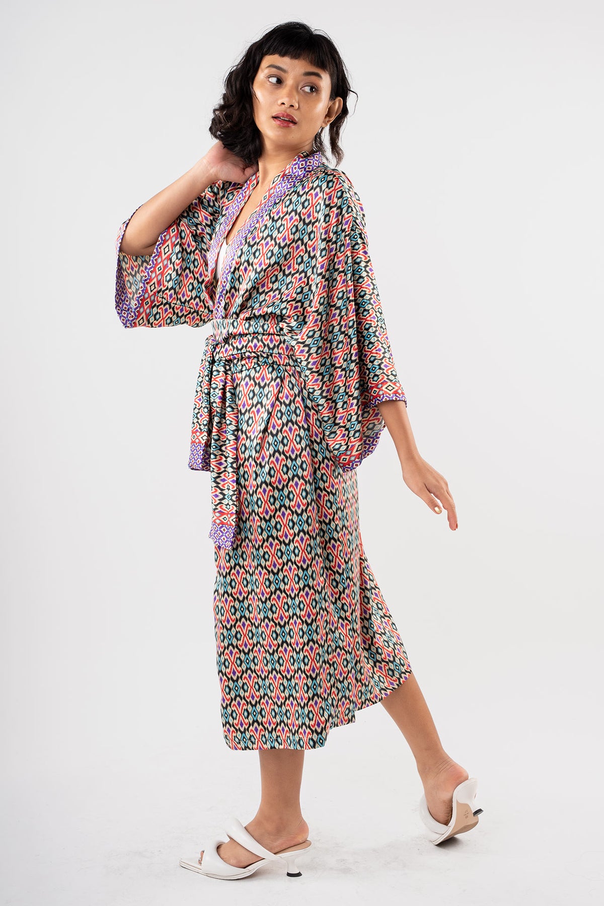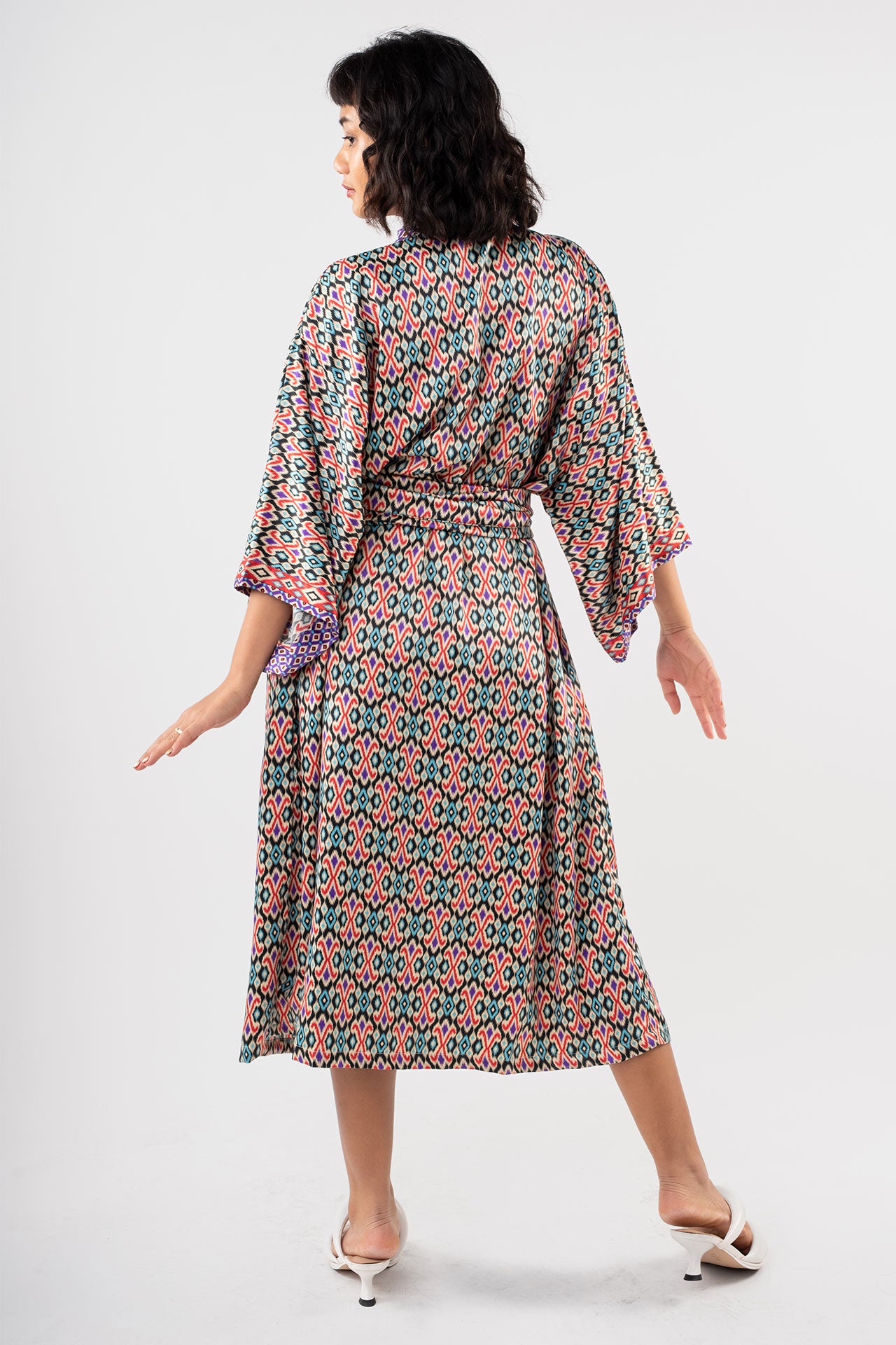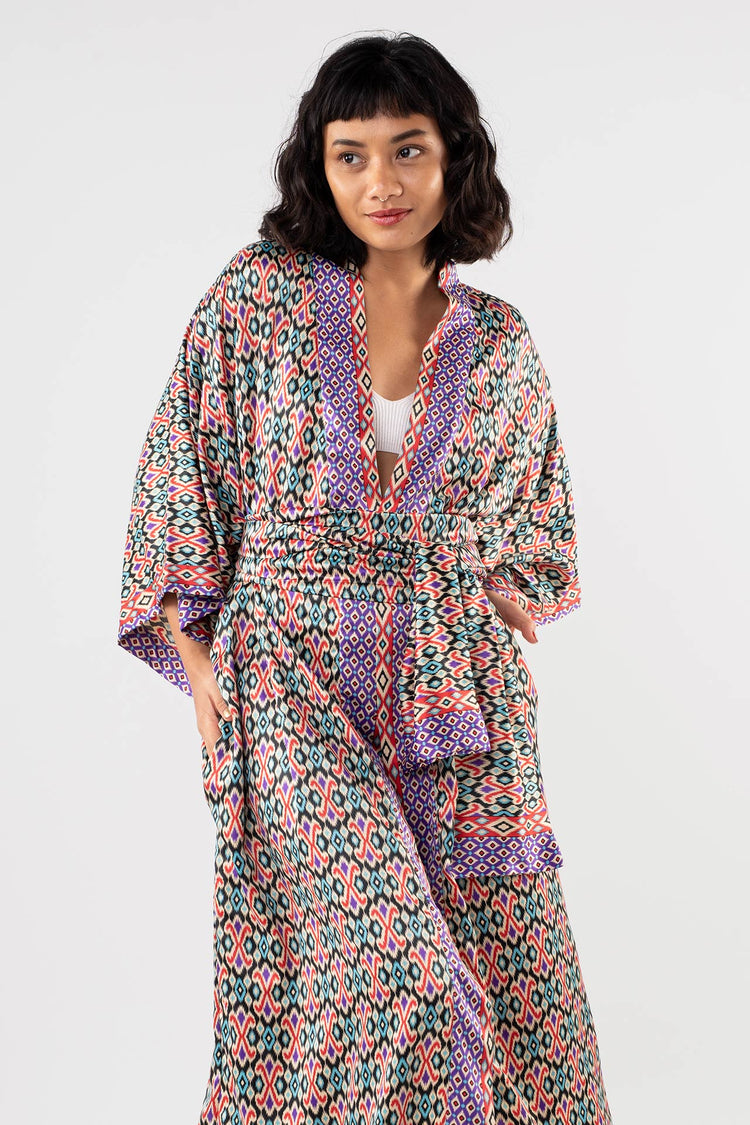 The combination of complex designs and luxurious fabric make every kimono-kaftan robe one-of-a-kind. Limited availability of each item ensures a strong bond between the robe and its owner. Complete the look with the included obi belt that can also function as a head wrap or scarf. This adaptable garment adapts to any event, from a formal gathering to a day at the beach, or to casual time at home or a night out. Wear it unclosed, with the belt, or as a kaftan.