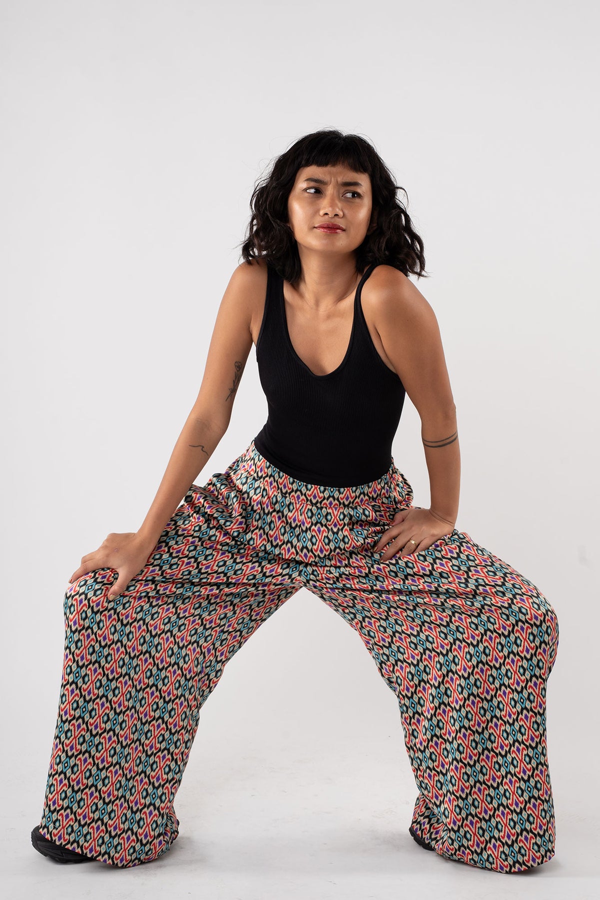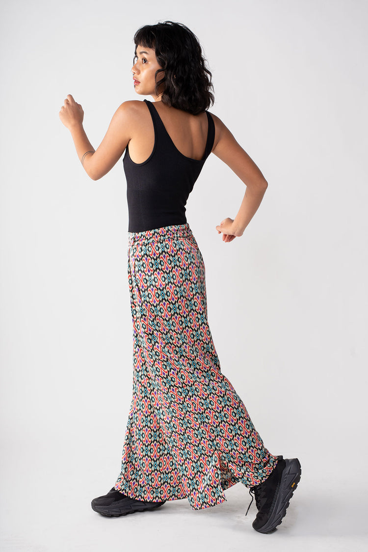 Rafiki Party Pants are flowy bottoms that add fun and flare to any ensemble. These wide legged palazzo pants had a waistband that is flat in front and garterized in back. Party pants are your perfect flexible and versatile pants for every occasion, be it a beach trip, a wedding, and of course, a dance party.